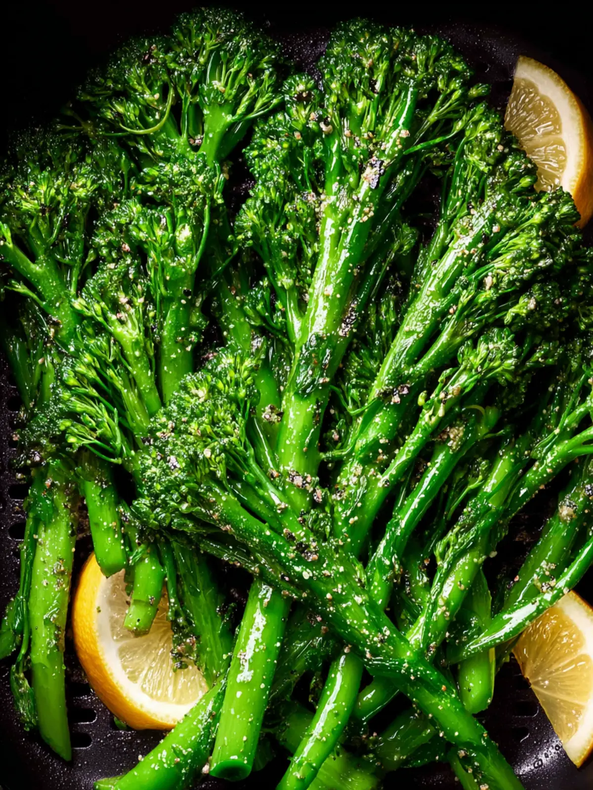 5. Remove the broccolini from the air fryer, sprinkle with Parmesan cheese, and a squeeze of lemon juice.