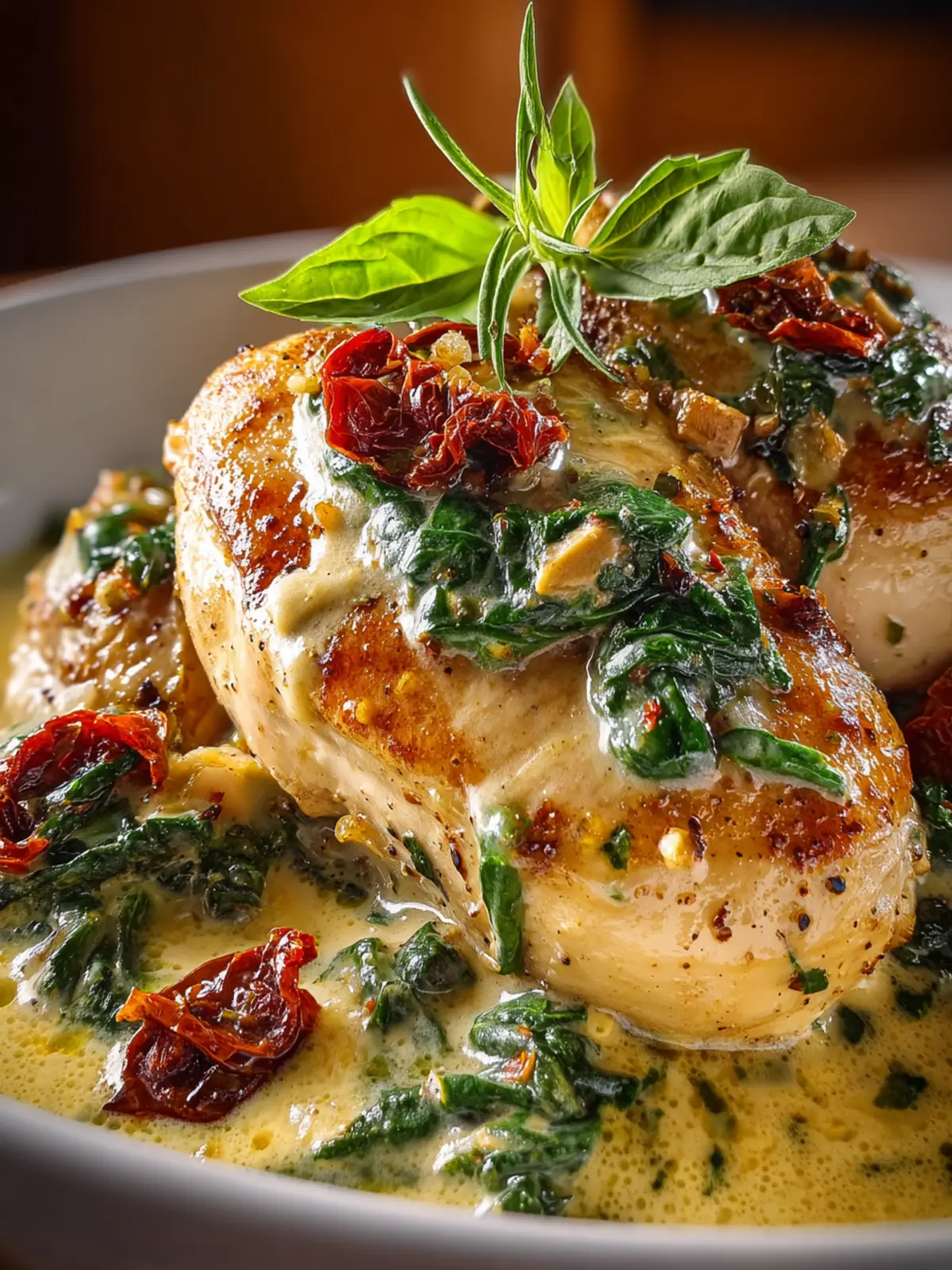 7. Serve the creamy Tuscan chicken over cooked pasta, rice, mashed potatoes, or with crusty bread. Spoon plenty of sauce over the top and garnish with fresh basil before serving.
