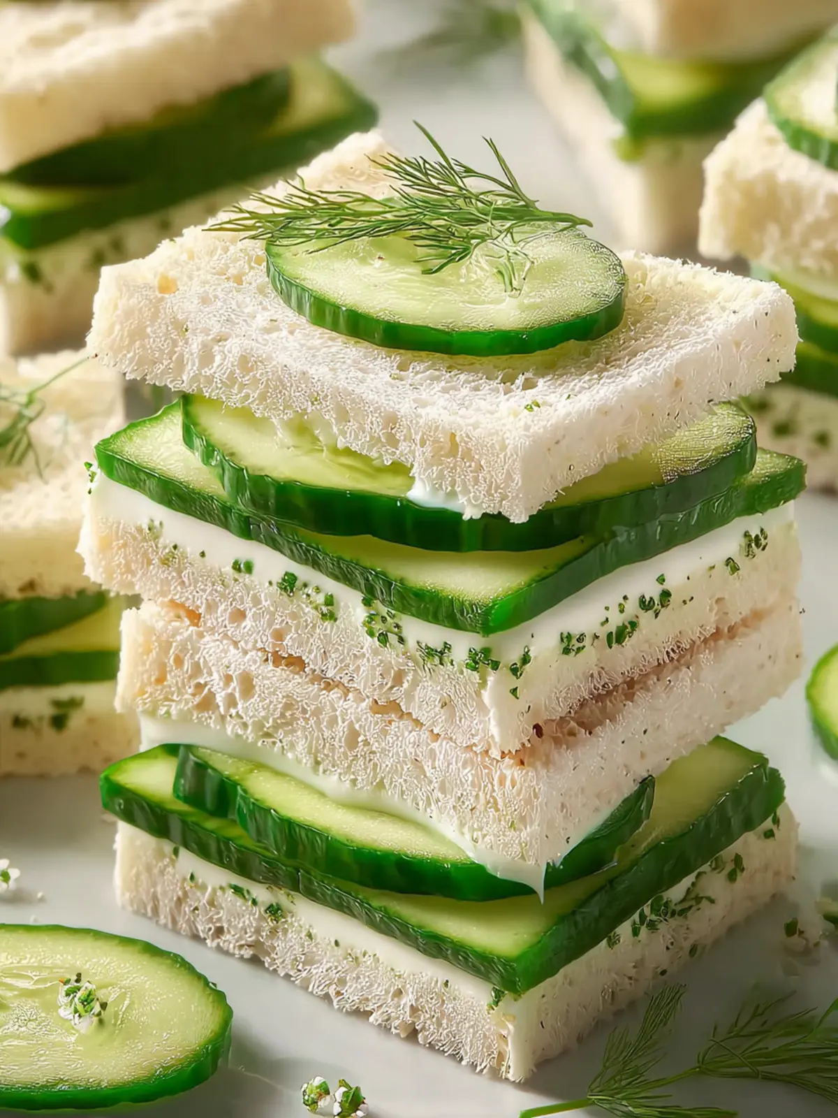 - Arrange the cucumber tea sandwiches on a platter, garnish with extra dill or cucumber slices if desired, and serve chilled.