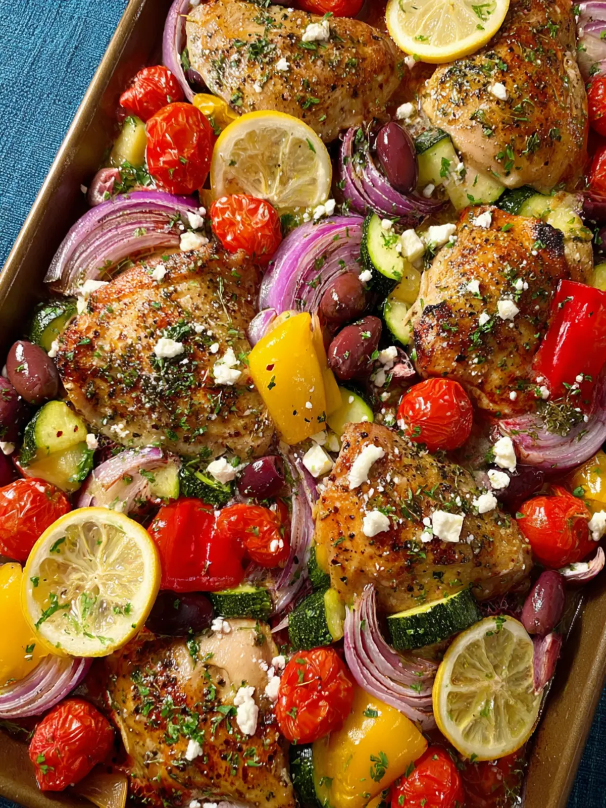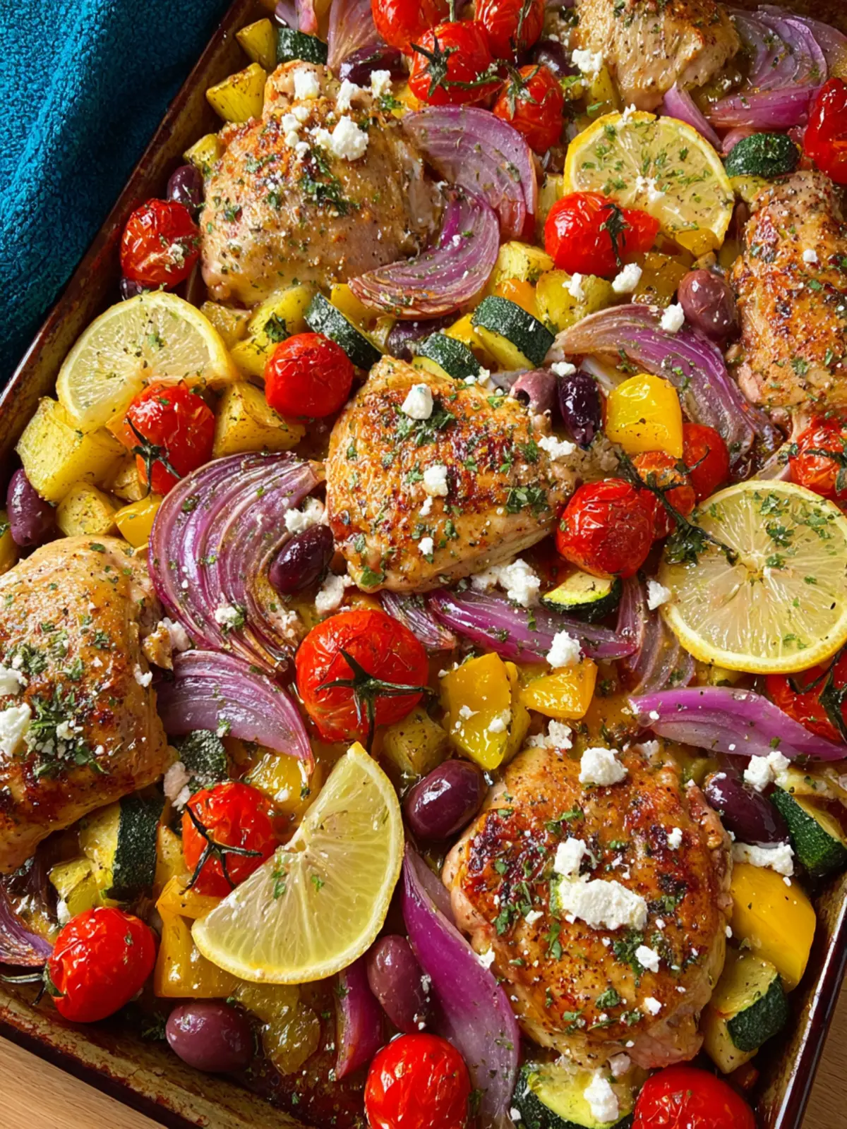This delicious Mediterranean baked chicken recipe features marinated chicken thighs paired with roasted vegetables, kalamata olives, and feta cheese for a flavorful and hearty meal.